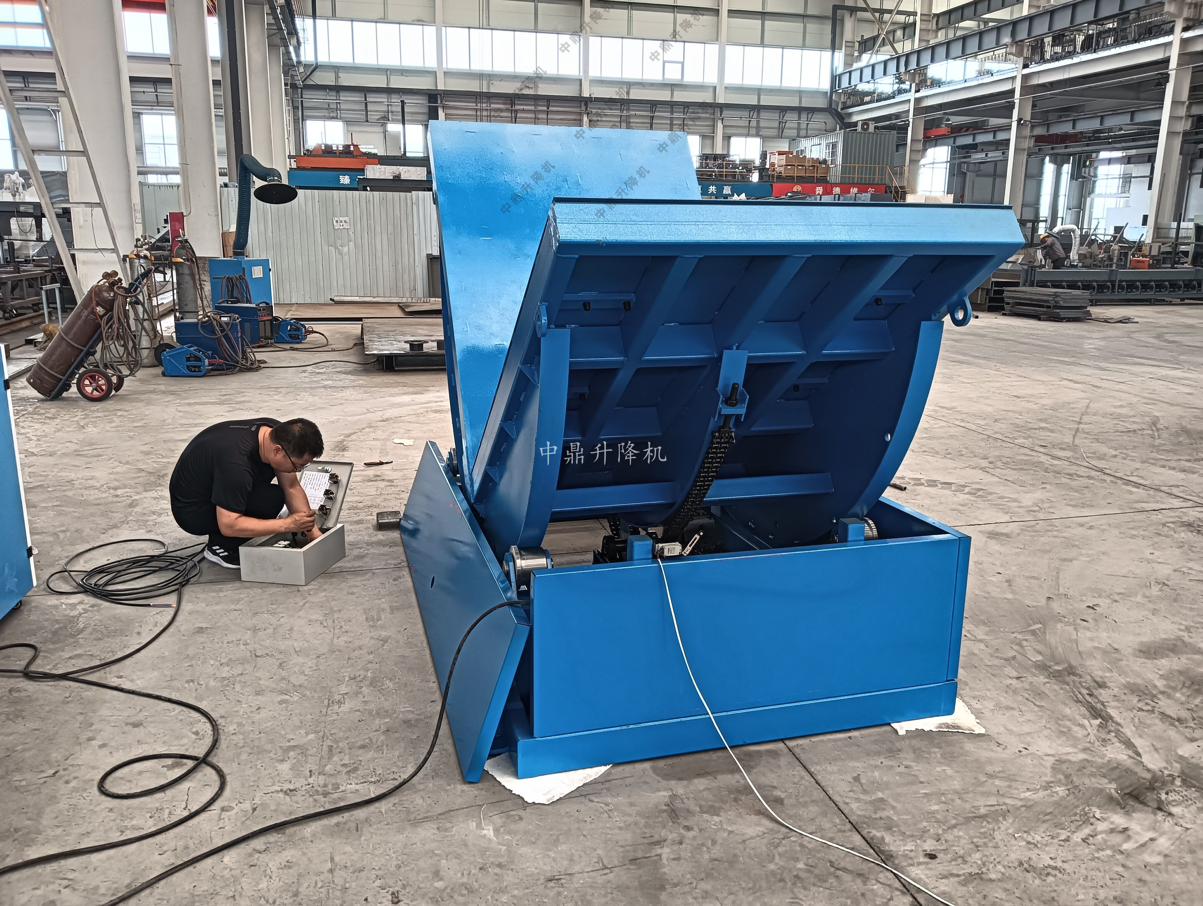 鏈條翻轉平臺是一種專門用于重型工件(如模具、鑄件、機械零部件等)提升和翻轉作業的機械設備。該設備通過鏈條傳動系統實現工件的精準提升和翻轉,最大承載量為10噸,廣泛應用于制造業、維修廠以及物流領域。