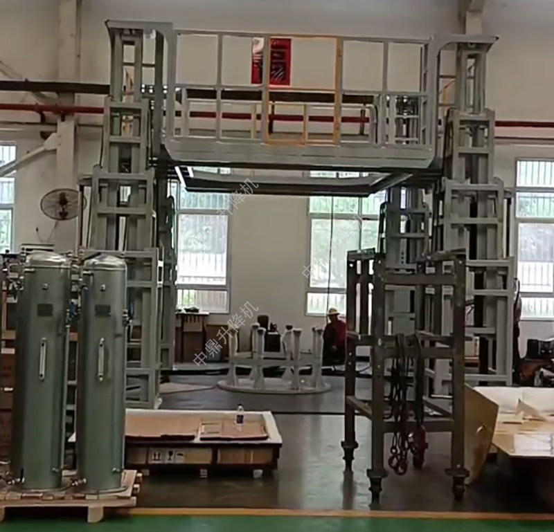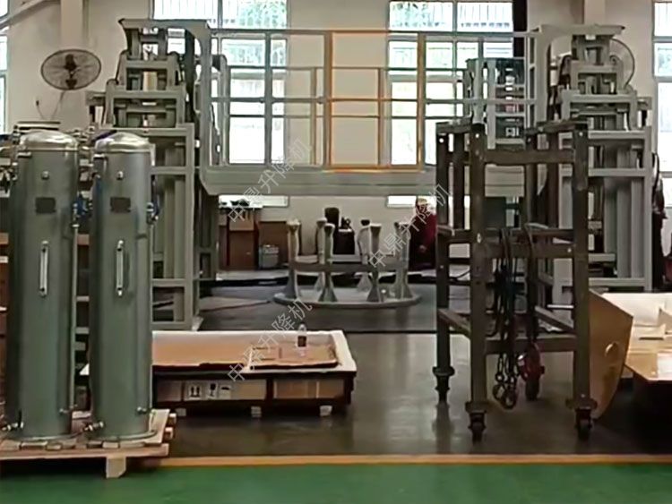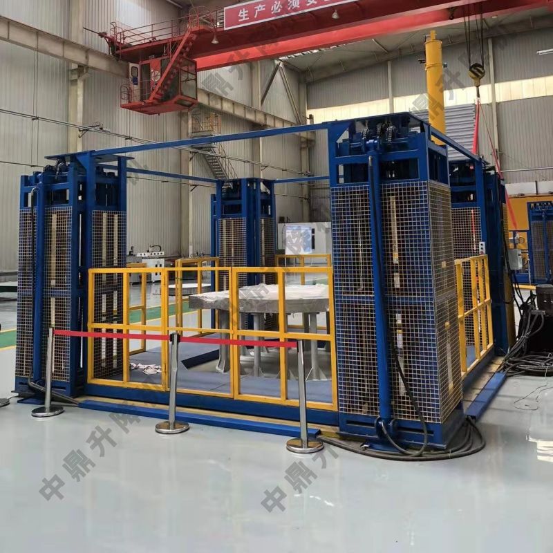 多級套缸式液壓升降平臺,由四組套缸式支腿、載重平臺、升降油缸、牽引鏈條、泵站、控制系統組成。通過泵站驅動油缸帶動四組套缸支腿的升降,連同平臺一起升降。