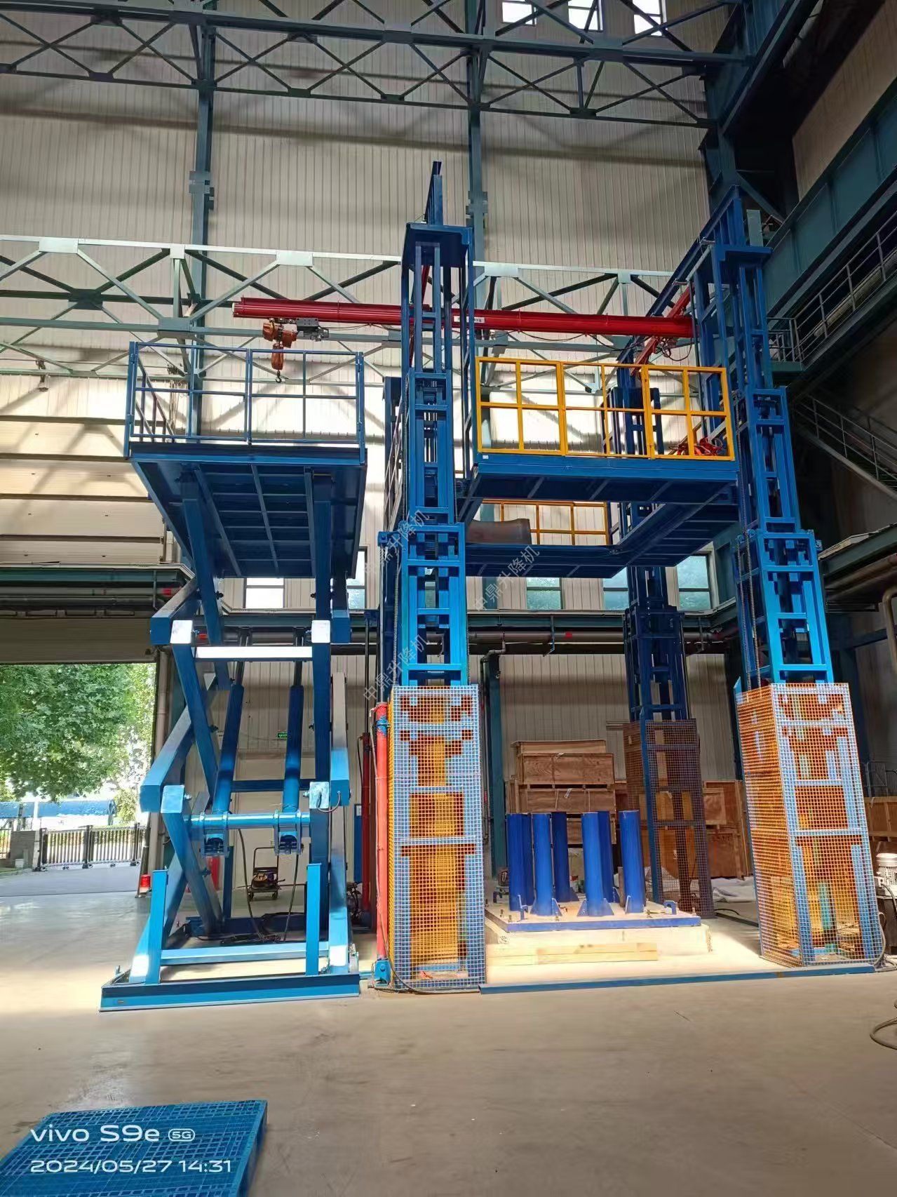 電解槽制造的過程中,由于電解槽長度較大,要垂直組裝,結構件、電極及隔膜組件要按照一定的順序和工藝從下往上一層一層安裝到固定件上,這必然要用到專用的升降機設備實現對電解槽組件的組裝。